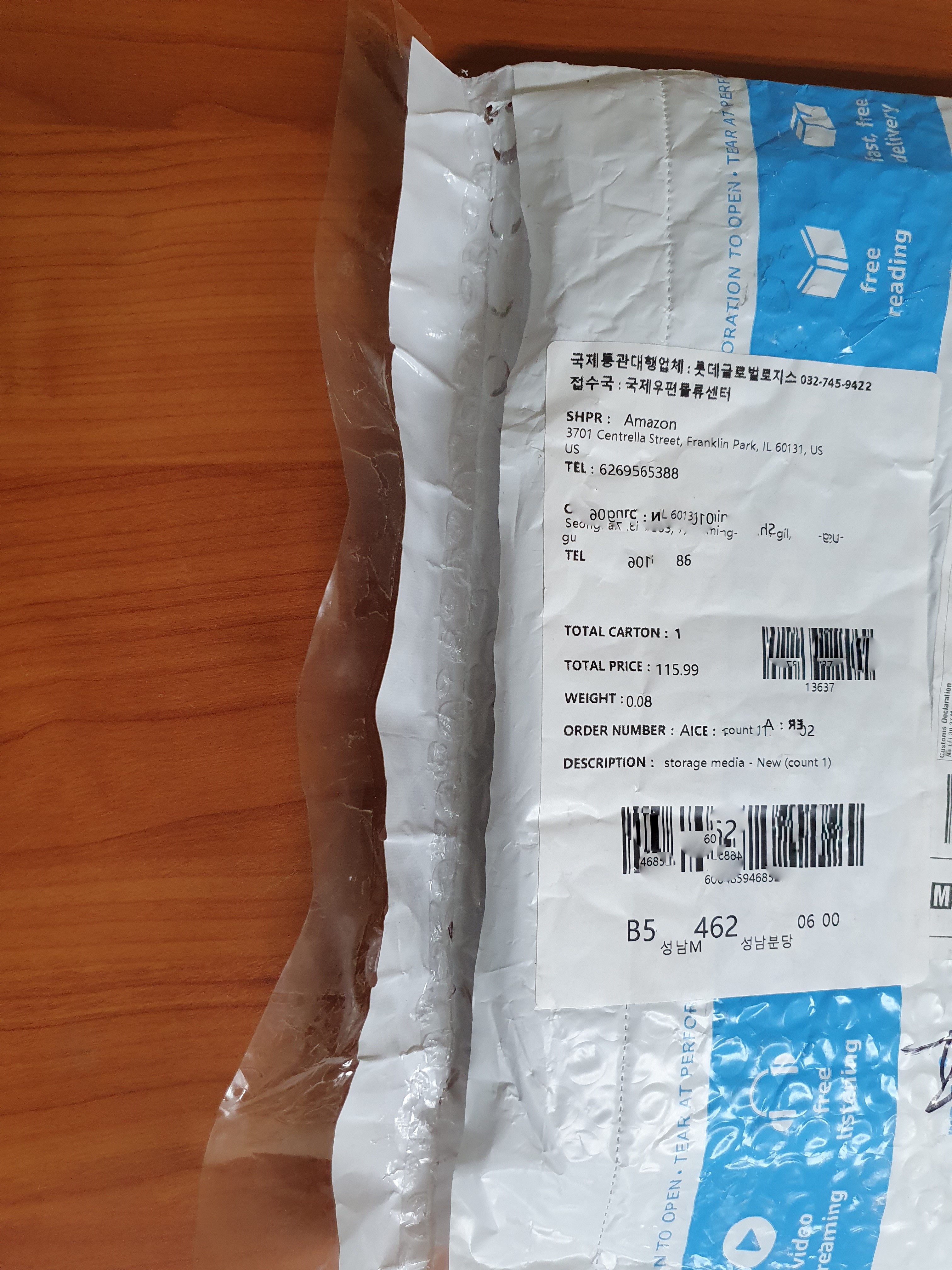 블랙프라이데이 세일 기간에 다양한 제품들을 해외직구로 구매하곤 합니다. 배송 기간은 적당했습니다. 하지만 황당한 일은 우체국 직원분이 전달해주면서부터입니다. 뭐를 주문하신 건데 이렇게 가볍나요? 순간 나도 뭐였지..? 조명이 빋쳐봐도 내용물은 보이지 않았습니다. 옆구리 쪽이 터져 있을 거라곤 생각지도 못했습니다. 받고 나서 알게 되었고 다행히도 우체국 직원분이 근처에 계셔서 확인을 하고 수신 사인을 한 것을 취소했습니다. 우체국에 빠졌는지 찾아보고 연락을 주신다고 하였고, 다행히도 우체국에서 분실물을 찾았고 다음날 다시 받을 수 있었습니다. 언제부터인지 아마존의 배송 포장 상태가 많이 간소화되면서 부실 해진듯한 느낌이 듭니다.